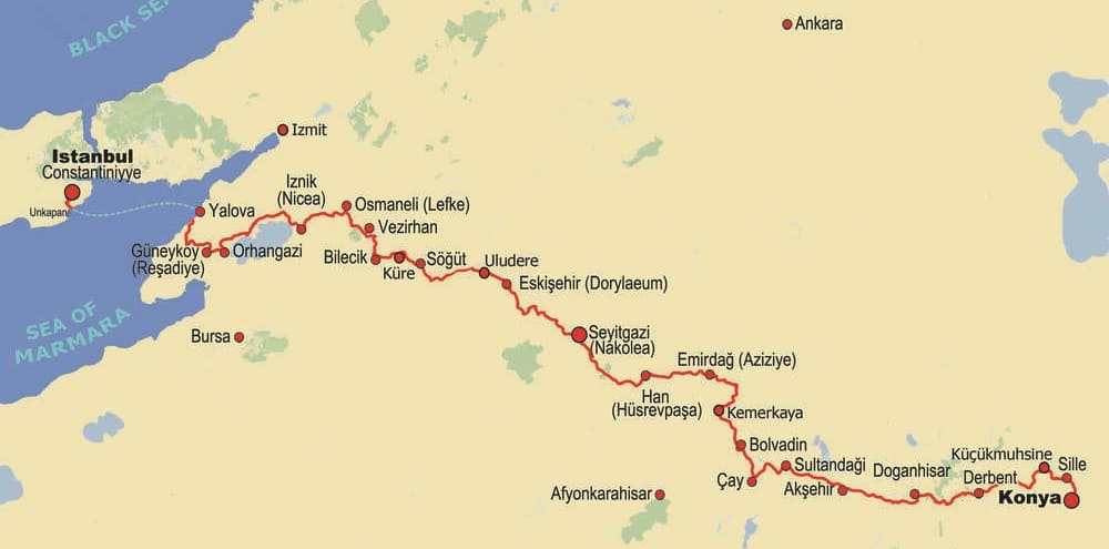 Суфийская тропа тянется на 800 километров от Стамбула до Коньи по маршруту хаджа (паломничества) османского султана. В самом начале она соединяется с Тропой Султана, которая идет из Вены через Австрию, Словакию, Венгрию, Хорватию, Сербию, Румынию, Болгарию и Грецию. После Коньи путь продолжается древней дорогой в Иерусалим и Мекку.