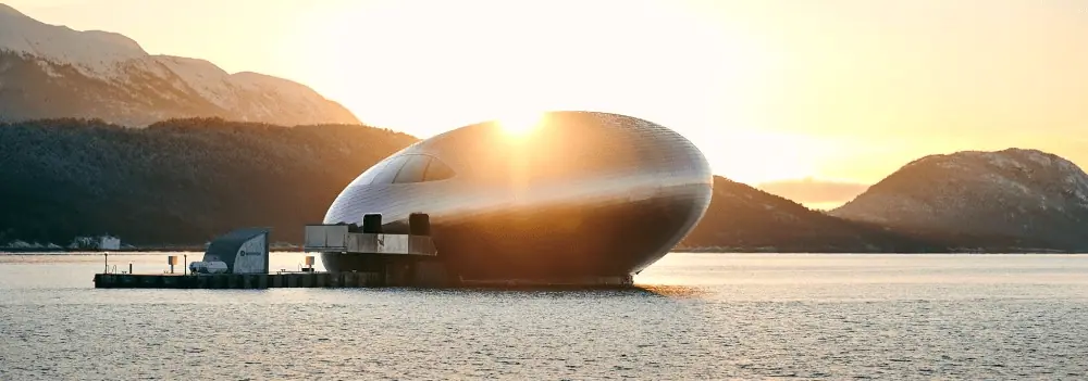 Ресторан концепции high-end, затерянный посреди фьорда Хардангер. Зал находится внутри футуристической плавучей сферы Salmon Eye, изначально предназначавшейся для изучения подводного мира местных вод. Чтобы попасть за стол, нужно прокатиться на электрической лодке. Рейсы обслуживают не более 24 гостей в день.