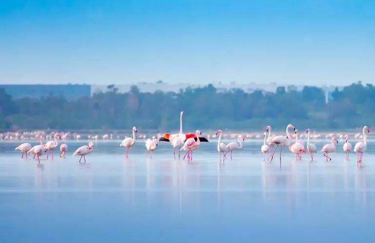 Весной и осенью здесь собираются огромные стаи фламинго. Озеро заполняется водой, поверхность которой из-за соли становится зеркальной и сливается с небом на линии горизонта. В ней отражаются ярко-розовые птицы, которые совсем не боятся щелчков фотокамер и туристов.
