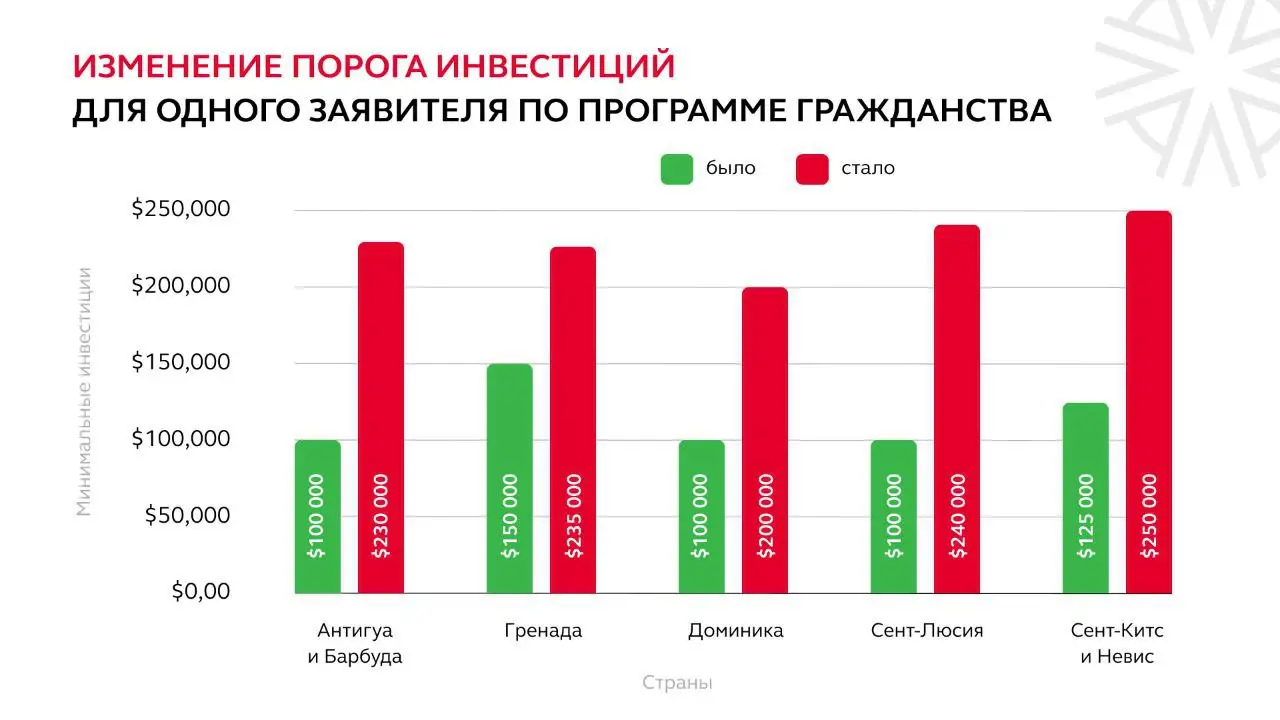 График ниже наглядно показывает, как изменились условия участия в инвестиционных программах получения гражданства:
