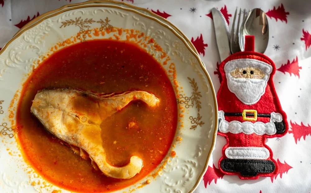 - Главным блюдом обязательно будет уха из карпа под названием халасле (halászlé) или запеченный карп (ponty) с картофелем. Рыбная чешуя по форме напоминает монетки, а значит съесть рыбное блюдо — к богатству. Как и в Чехии, в Венгрии принято класть чешуйки от рождественского карпа в кошелек и хранить их там целый год, «приманивая» деньги.