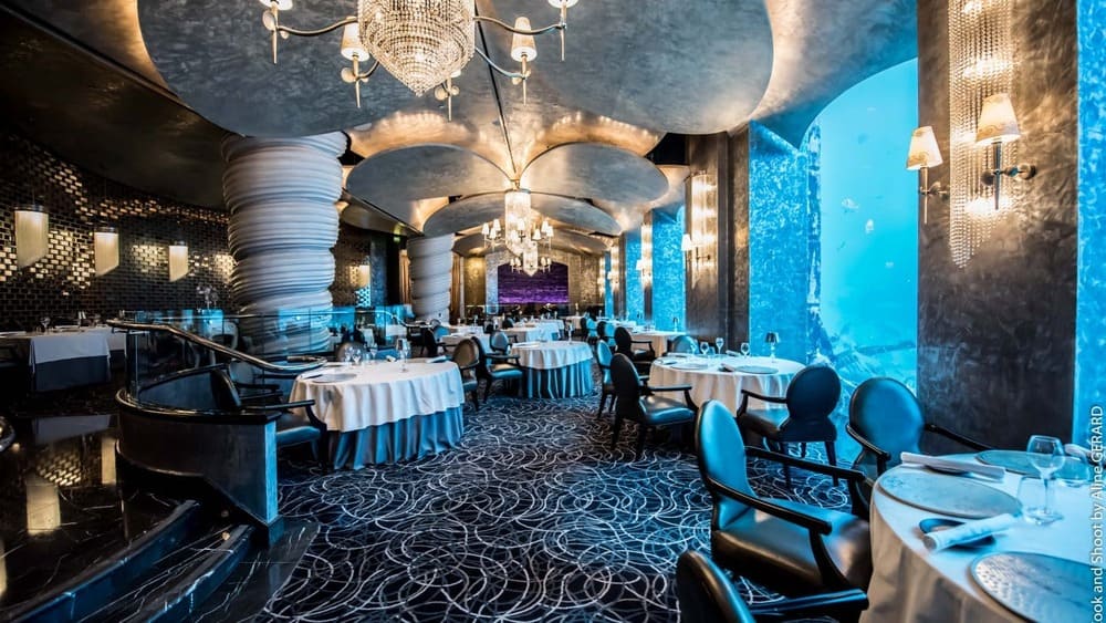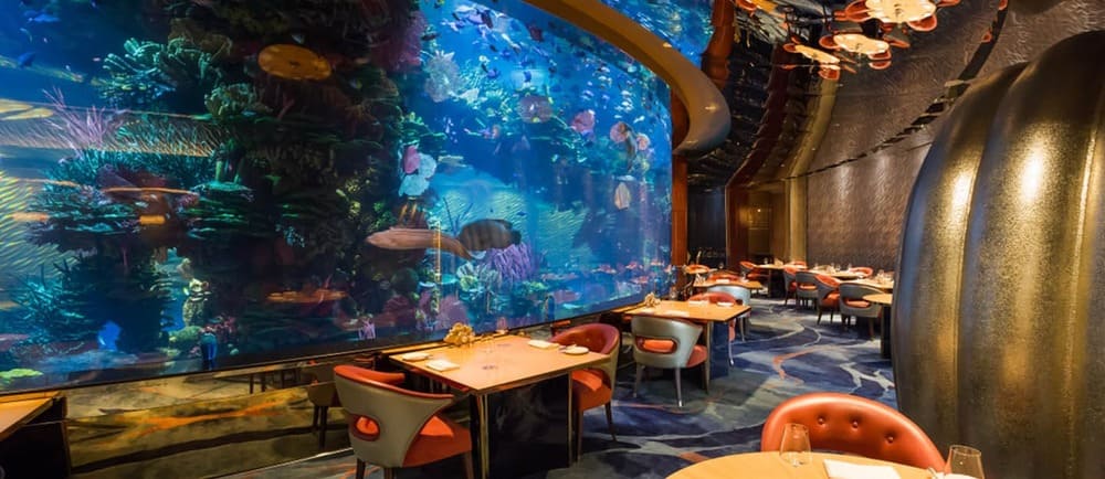 Ресторан расположен на нижнем этаже в одном из символов Арабских Эмиратов – небоскребе-парусе Бурдж-эль-Араб. Спускаясь в залы, гости окажутся в гигантской раковине моллюска: вместо жемчужины в ее центре – огромный аквариум от пола до потолка с тысячами тропических рыб. Подводная тематика активно подчеркивается во всем интерьере: от живых цветов, которые напоминают водоросли, до кораллового декора на столах.