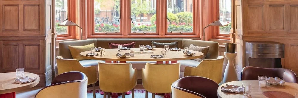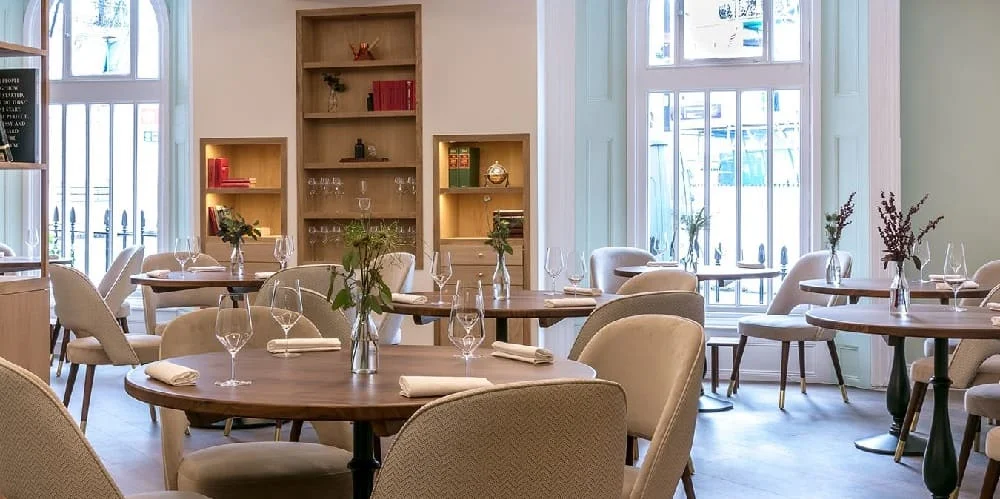 Уютный и созданный с вниманием к деталям ресторан Элен Дарроз (Hélène Darroze) в иконичном отеле The Connaught. Интерьер создавал французский архитектор-кутюрье Пьер Йованович. Для Hélène Darroze Пьер выбрал пудровые оттенки, изогнутые и сглаженные линии, кресла из бархата и кожи – все, чтобы окутать гостя теплом и гостеприимством.
