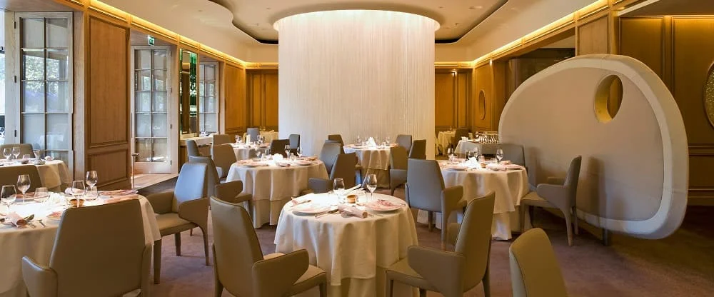 В интерьере – обилие природных материалов, а цветовая гамма напоминает о роскошных английских садах – преобладают оттенки угольно серого и зеленого. Жемчужиной ресторана стал приватный зал Table Lumière, в котором с потолка свисают 4500 мерцающих оптоволоконных ламп, а стол сервируют фарфором Hermès, столовым серебром Puiforcat и хрусталем Saint-Louis.