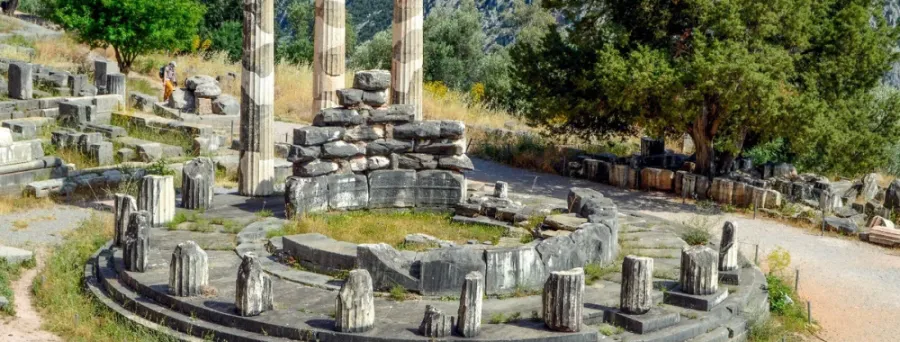 Если вы будете в Дельфах, то выделите 30-40 минут на посещение храма Аполлона, в котором служили оракулы. В 2024 году от него остались только руины, представляющие собой небольшую кладку и несколько колонн.
