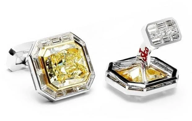 Самые дорогие запонки в мире были созданы брендом Jacob & Co и стоят $4 200 000. Это восьмиугольные оправы, сделанные из белого золота, которые обрамляют желтые бриллианты весом в 10,76 карат. Окантовка выполнена из белых бриллиантов общим весом в 21,29 карат.