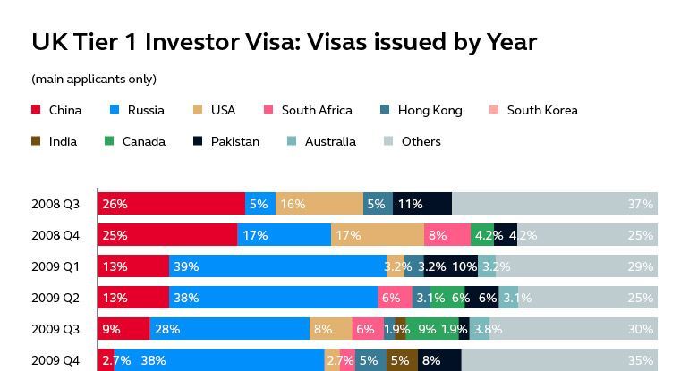 Согласно статистике, 43% сверхбогатых иностранцев, получивших визу инвестора Tier 1, которая предполагает минимальные инвестиции в размере €2 млн, — граждане Китая. На втором и третьем месте — граждане США (8% заявителей) и России (7%).