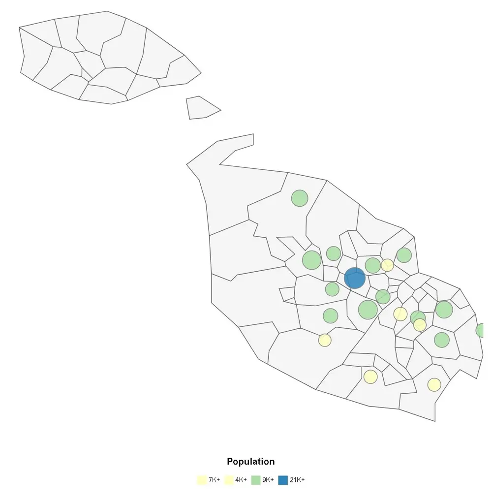 Главный «мегаполис» Мальты — Биркиркара, его население составляет 21,6 тыс. человек. За ним следует Корми с показателем 18,2 тысячи.